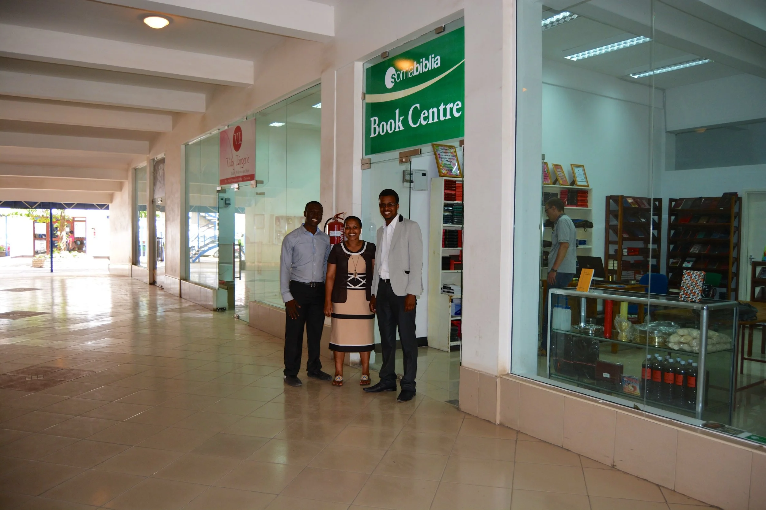 The sales personel at Soma Biblia Arusha: Martin Mwaisumo, Melania Joakim and Praygod Kimaro.